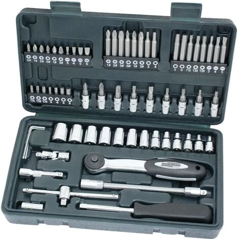 Antrieb: 1/4″ (6.3 mm) · Funktion: metrisch · Gewicht: 1500 g · Material: Chrom-Vanadium Stahl · Mengenangaben (LOV – Nur für Titel): 65teilig