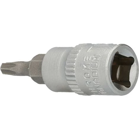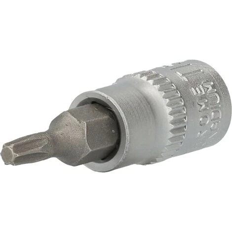 Die BRILLIANT TOOLS Torx-Bit-Stecknuss mit Stirnlochbohrung BT020982 hat einen 1/4″ (6,3 mm) Innenvierkant-Antrieb, der nach DIN 3120 gefertigt ist. Der eingepresste phosphatierte Bit hat die Größe TB15 mit einer Bohrung an der Stirnseite. Die Bit-Stecknuss hat eine Gesamtlänge von 38 mm, die Klingenlänge beträgt 17 mm. Die Oberfläche ist an der Antriebsseite und an der Bitseite matt verchromt, diese ist durch eine Längsrändelung getrennt.