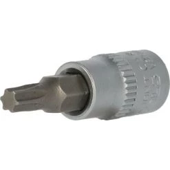 Die BRILLIANT TOOLS Torx-Bit-Stecknuss mit Stirnlochbohrung BT020984 hat einen 1/4″ (6,3 mm) Innenvierkant-Antrieb, der nach DIN 3120 gefertigt ist. Der eingepresste phosphatierte Bit hat die Größe TB25 mit einer Bohrung an der Stirnseite. Die Bit-Stecknuss hat eine Gesamtlänge von 38 mm, die Klingenlänge beträgt 17 mm. Die Oberfläche ist an der Antriebsseite und an der Bitseite matt verchromt, diese ist durch eine Längsrändelung getrennt.