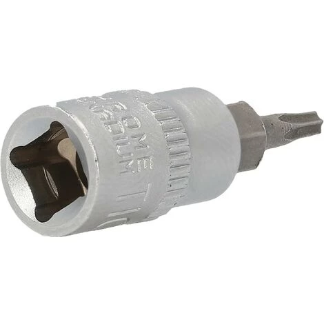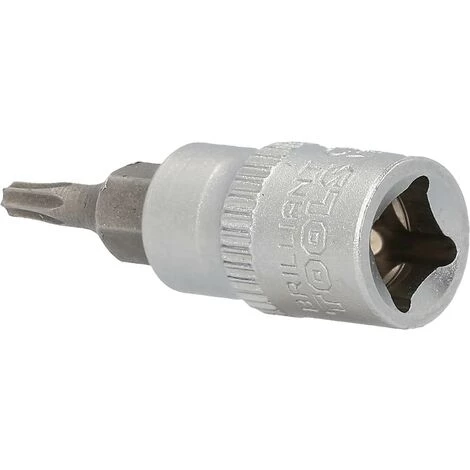 Die BRILLIANT TOOLS Torx-Bit-Stecknuss BT020971 hat einen 1/4″ (6,3 mm) Innenvierkant-Antrieb, der nach DIN 3120 gefertigt ist. Die eingepresste phosphatierte Bit-Stecknuss hat die Größe T10. Die Bit-Stecknuss hat eine Gesamtlänge von 38 mm, die Klingenlänge beträgt 17 mm. Die Oberfläche ist an der Antriebsseite und an der Bitseite matt verchromt, diese ist durch eine Längsrändelung getrennt.