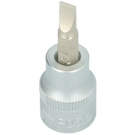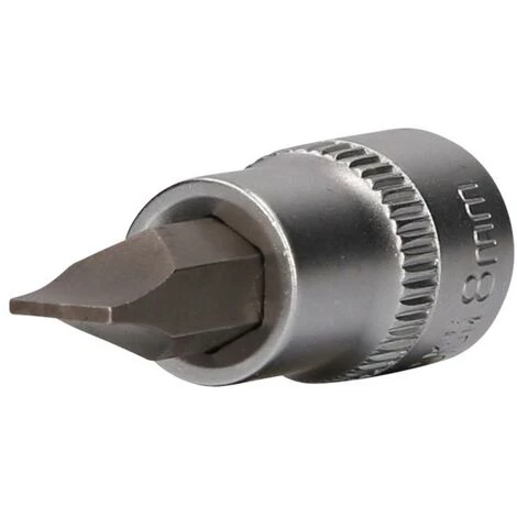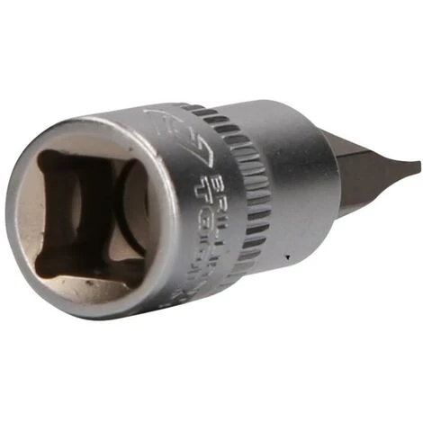 Die BRILLIANT TOOLS Bit-Stecknuss BT021862 hat einen 3/8″ (10 mm) Innenvierkant-Antrieb, der nach DIN 3120 gefertigt ist. Der eingepresste phosphatierte Bit mit Schlitz-Profil hat die Größe 2 x 8 mm. Die Bit-Stecknuss hat eine Gesamtlänge von 49 mm, die Klingenlänge beträgt 17 mm. Die Oberfläche ist an der Antriebsseite und an der Bitseite matt verchromt, diese ist durch eine Längsrändelung getrennt.