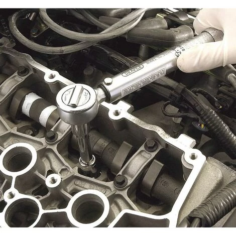 Am Griff des Schraubenschlüssels befindet sich ein rotierender Umschalthebel, um zwischen Hauptskala Nm und Nebenskala lb-in umzuschalten. Wenn das eingestellte Drehmoment erreicht ist, erzeugt der Schlüssel ein hör- und fühlbares Auslösesignal. Dieser Drehmomentschlüssel wird zum einfachen Transport und zur Aufbewahrung in einem blasgeformten Gehäuse geliefert.