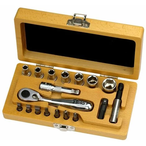 felo XS-Classic 1/4 Holz-Werkzeugbox mit Miniratsche,Bits und Stecknüssen, 18-teilig | Hersteller-Nr.: 00005771866 | EAN: 4007157623676 |