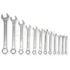 Umfangreicher Satz Schraubenschlüssel, hergestellt aus speziellem, rostfreiem Kohlenstoffstahl (Carbon) für maximale Stabilität und Haltbarkeit. Die Köpfe der Ringschlüssel sind um 15 Grad geneigt.