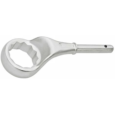 Zugringschlüssel schwere Ausführung • Anwendung: Ringschlüssel für höchste Drehmomente.gesenkgeschmiedetpolierter und gekröpfter Ringzur Verwendung mit Aufsteckrohr Nr. 52052 konzipiert • Vorteil: gesenkgeschmiedeter Stahl mit hoher Materialfestigkeit und geringer RissempfindlichkeitÜbertragung von hohen Drehmomenten