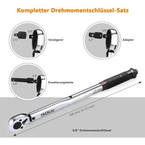 - ▲ 【 Lieferumfang】1 X 3/8-Zoll-Laufwerk klicken Drehmomentschlüssel, 1 X 3/8 Zoll Laufwerk (F) zu 1/4 Zoll Laufwerk (M) Reduzierstück, 1 X 3/8 Zoll Laufwerk (F) zu 1/2 Zoll Laufwerk (M) Adapter, 1 X 3/8-Zoll-Antrieb Schlagbuchse Verlängerungsstange, 1 X Garantie, 1 x Bedienungsanleitung,1 x Kalibrierzertifikat