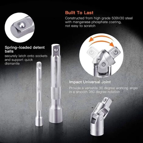 ▲【Perfekte Materialien und Rostschutz】Alle steckdosen und Zubehörteile sind aus kaltgeformtem Chrom-Vanadium-Legierungsstahl gefertigt und wärmebehandelt, um eine ausgezeichnete Festigkeit zu gewährleisten, und eine korrosionsbeständige schwarze galvanische Deckschicht für eine lange Lebensdauer