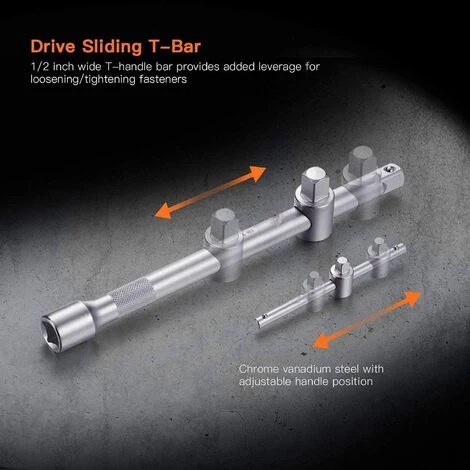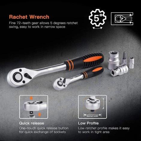 ▲【Konfiguration】 1/2 “ und 1/4″ (metrische tiefe und flache lange Steckdose + Bit-Steckschlüsseleinsatz + Torx-Steckdose + tiefe Steckdose +Bits +Bohrer + Drehgriff + verschiebbarer T-Stab + Kreuzgelenk + Verlängerungsstange + Zündkerzen-Steckdose + Sechskantschlüssel + rutschfeste Handschuhe + tragbare Schachtel)