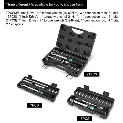 15 STÜCKE (1/4 Zoll Antrieb): 1 * Drehmomentschlüssel (2-24 Nm), 1 * Verbindungsstange, 13 * Bits