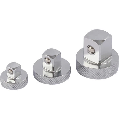 Kraftwerk 123003 Vergrößerungs-Adapter-Satz 3-tlg. Ein Vergrößerungs-Adapter-Satz bestehend aus 3 Übergangsstücken für 1/4″, 3/8″ und 1/2″ Antrieb. Eine sehr praktische Lösung für beengte Platzverhältnisse oder wenn Stecknuss und Ratsche einen unterschiedlichen Antrieb haben. Die Adapter sind auch gut zum rationellen andrehen von Schrauben geeignet. Die benötigte Stecknuss mit der Schraube auf den Adapter stecken und dank dem gerändelten Rand ist das ein/-ausdrehen sehr leicht und auch sehr gefühlvoll möglich.