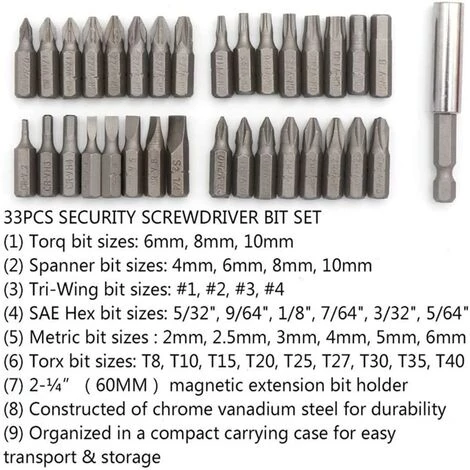 Lieferumfang: Dieses Set enthält 1 Magnetverlängerungs-Bithalter (5,7 cm) und 4 Tri-Wing-Bits, 6 SAE-Sechskant-Bits, 3 Torq-Bits, 4 Schraubenschlüssel-Bits, 6 metrische Bits und 9 Torx-Bits . HOHE QUALITÄT: Diese Bits bestehen aus wärmebehandeltem Chrom-Vanadium-Stahl.