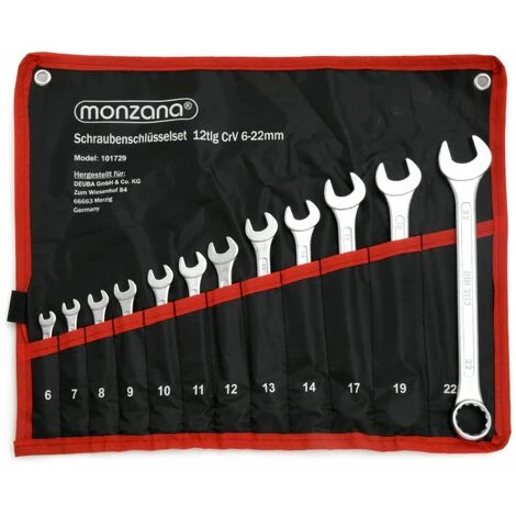 Umfangreiche Chrom Vanadium Schraubenschlüsselset entsprechend der DIN 3113 A. mit praktischer Rolltasche zum Aufhängen an der Wand. Verchromte Ausführung mit mattiertem Finish für den täglichen Einsatz geeignet.