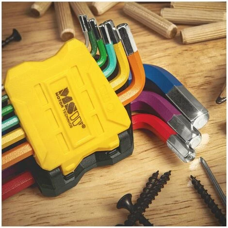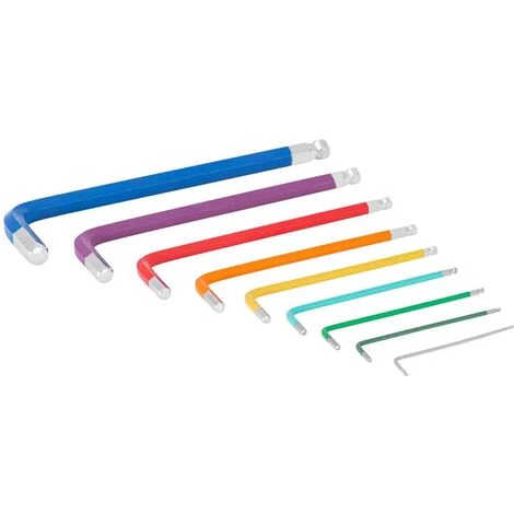Die Sechskantschlüssel mit Schlüsselweiten von 1,5 bis 10 mm überzeugen durch eine optimale Kraftübertragung wie hohem Drehmoment. Dank der Kugelkopf-Konstruktion können auch schwierige Schraubarbeiten unter Winkel bis 25° durchgeführt werden. Gut organisiert in einer Kunststoff-Halterung mit Größenmarkierungen und farbig markiert geht die Arbeit noch leichter von der Hand.