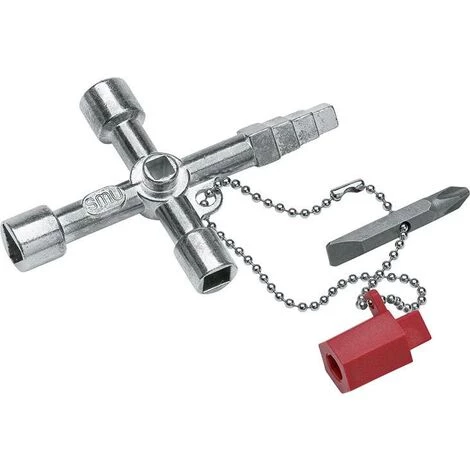 Schlüssel für die Bereiche Heizung-, Klima-, Sanitär- und Gebäudetechnik, z. B. für Tür- und Fenstergriffe oder zur Heizungsentlüftung. Mit Bit-Einsatz: Schlitz 1,0 x 7 mm und Kreuzschlitz PH2. Mit Adapter für 1/4″-Bits an einer Befestigungskette. Zusätzliche Bitaufnahme für 1/4″-Bits in einem Arm. Armlänge gesamt: 90 mm. Zink-Druckguss. Zink-Druckguss