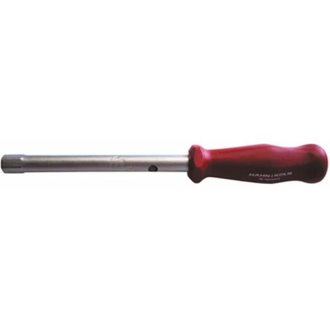 Sechskant-Rohr-Steckschlüssel nahtlos. aus C35 gehärtet. verchromt • Anwendung: Für lang überstehenden Gewindebolzen besonders geeignet. • Ausführung: Griff aus schlagfestem Kunststoff