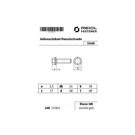 Sechskant-Flanschschrauben mit Sperr-Rippen unter dem Flansch 12×40 10 / 10.9, galv. verzinkt gelb chrom. | Eigenschaften: Werkstoff: Klasse 100, Oberfläche: verzinkt gelb, Durchmesser: 12 mm, Länge: 40 mm, Gewindeart: metrisches Gewinde, Gewinde: M 12, Werkstoffart: Stahl, Kopfform: Außensechskant mit Flansch, Vollgewinde: Ja, Gewindeausführung: Regelgewinde, Antrieb: Außensechskant, Spitze: ohne , Ausführung: mit Sperr-Rippen, Gewindeausprägung: metrisch;Voll, Gewindesteigung (fein): 40, Antriebsgröße: 17