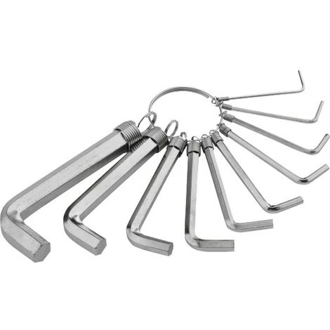 SPARTA-Sechskantschlüssel sind so konzipiert, dass sie den Benutzer beispielsweise bei der Montage / Demontage von Möbeln oder sogar bei mechanischen Arbeiten optimal unterstützen. Sie bestehen aus einem soliden und korrosionsbeständigen Material: Edelstahl, außerdem sind sie vernickelt. Um ihre Lagerung und ihren Transport zu erleichtern, werden sie mit einem Ring geliefert, mit dem sie aneinander befestigt werden können. Technische Informationen: Größen (in mm): 1,5, 2,0, 2,5, 3,0, 3,5, 4,0, 5,0, 6,0, 8,0-, 10,0 Härte: 45 HRC