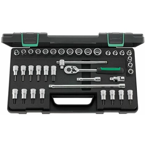 Steckschlüssel-Garnitur 3/8 Vierkant im robusten. stapelbaren ABS-Kunststoffkasten.37-teiligInhalt:11 Steckschlüsseleinsätze mit Doppelsechskant Nr. 45: SW 8; 10; 11; 12; 13; 14; 15; 16; 17; 18; 19 mm7 Steckschlüsseleinsätze für Außen TORX®-Schrauben Nr. 45TX:Gr. E5; E6; E7; E8; E10; E12; E146 INHEX-Einsätze Nr. 49: SW 4; 5; 6; 7; 8; 10 mm8 Schraubendrehereinsätze für Innen TORX®-Schrauben Nr. 49TX: Gr. T9; T10; T15; T20; T25; T27; T30; T401 Knarre Nr. 4352 Verlängerungen Nr. 427/3 (76 mm). Nr. 427/10 (240 mm)1 Quergriff Nr. 4251 Kardangelenk Nr. 428