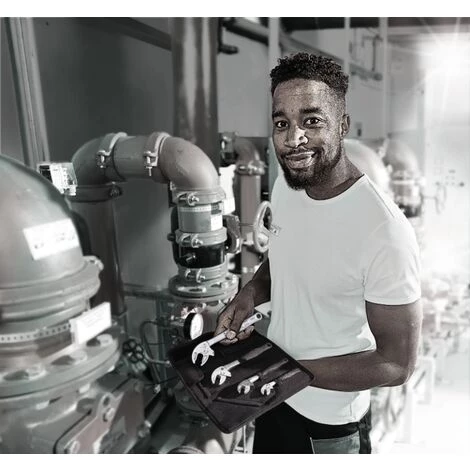 Viele Anwender wünschen sich ein universelles Schraubwerkzeug mit möglichst großem Einsatzspektrum. Ein einziges Werkzeug für mehrere metrische und zöllige Abmessungen sollte es sein. Es sollte sich automatisch auf die unterschiedlichen Schraubengrößen einstellen. Sicher zupacken, nichts beschädigen und eine hohe Arbeitsgeschwindigkeit ermöglichen. Durch die stufenlos und parallel geführten Backen werden mehrere Maulschlüssel-Einzelabmessungen ersetzt. Die benötigte Größe stellt sich beim Ansetzen an der Sechskant-Mutter oder -Schraube stufenlos von selbst ein. Der integrierte Hebelmechanismus klemmt die Sechskant-Schraube bzw. Mutter zwischen den Backen sicher ein, was die Gefahr des Abrutschens und der Beschädigungen deutlich verringert. Für das schnelle und durchgängige Schrauben ohne Absetzen sorgt die Ratschenfunktion. Durch die Nutzung der Eckweiten-Prismen ist ein Rückschwenkwinkel von nur 30° realisierbar. Die Ein-Schenkel-Konstruktion in Verbindung mit der Ratschenfunktion und dem Eckweitenprisma ermöglicht das Arbeiten auch in engen Bauräumen. Der verstellbare Joker 6004 ist das universelle Schraubwerkzeug. Selbstjustierend. Zupackend. Ratschend. Vierteiliger Satz für mindestens 18 unterschiedliche metrische und zöllige Schraubenantriebe in kompakter Falttasche. Die Tasche ist durch das Klettsystem auf der Rückseite zur Befestigung an Wand, Regal, Werkstattwagen und am Wera 2go System geeignet.