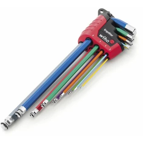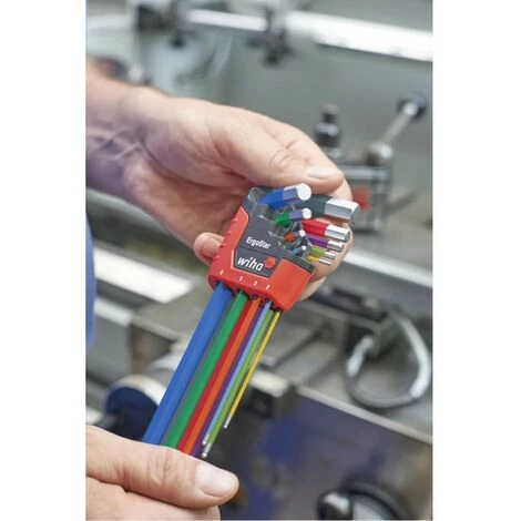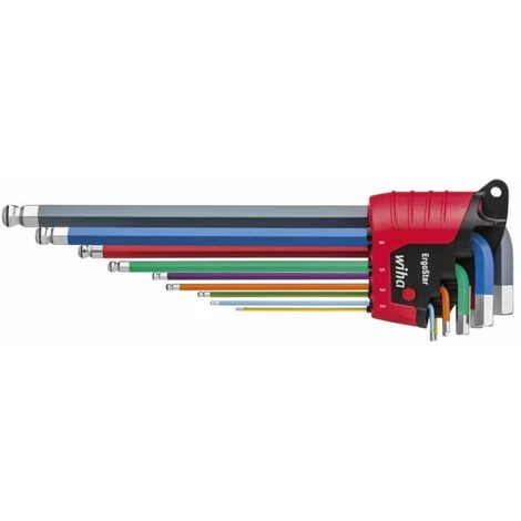 Anwendung: Geeignet für das Verschrauben sämtlicher Sechskant-Schrauben und das Herausheben von versenkten Normschrauben sowie das Einführen und Verschrauben in waagrechte, schräge oder tiefe Sacklöcher. Wer kennt das nicht? Bei vielen Stiftschlüsselhaltern ist es umständlich, einzelne Schlüssel zu entnehmen oder wieder in den Halter zurückzuführen. Doch damit macht der Wiha ErgoStar jetzt Schluss, denn er löst dieses Problem auf eine geniale Art und Weise. Die Drehung eines einzelnen Stiftschlüssels im Halter führt dazu, dass sich alle anderen Schlüssel im gleichen Winkel zur Seite drehen und eine schnelle und komfortable Entnahme ermöglicht wird. Eine Klemmung in dem Haltern sorgt dafür, dass die Schlüssel sowohl bei geschlossenem, als auch bei geöffnetem Halter nicht herausfallen können. Zudem sind die farbigen Stiftschlüssel schnell und einfach auffindbar und dank des Leuchtlacks auch im Dunkeln mit UV-Licht gut zu finden. Somit reduziert sich die Suchzeit verloren gegangener Stiftschlüssel und beim Warten von Anlagen wird die Gefahr von vergessenen Werkzeugen in der Maschine verringert. Dank der MagicRing®-Haltefunktion mit Federstahlring halten die Stiftschlüssel alle Sechskant Normschrauben ohne Magnet in jeder Lage perfekt fest. Der Sechskant-Kugelkopf ermöglicht müheloses Verschrauben unter einem Winkel von bis zu 25Grad. Das Stiftschlüsselset enthält neun farbige Sechskant-Stiftschlüssel in den gängigen Größen.