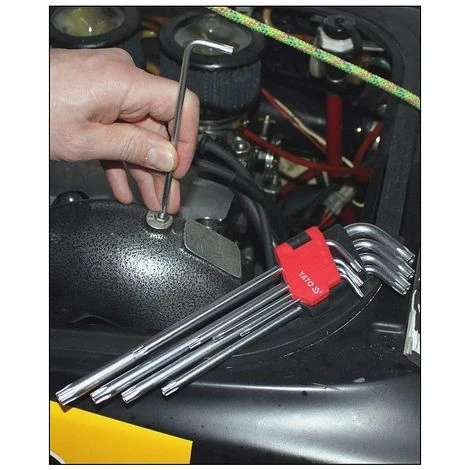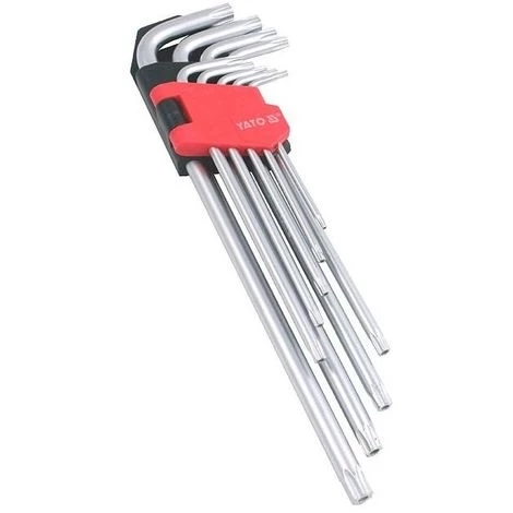 Hochwertig verarbeitetes 9-teiliges Torx Schlüssel Set. Die Torx Schlüssel sind aus gehärtetem Stahl gefertigt und werden in einem praktischen Gehäuse aus bruchsicherem Kunststoff geliefert. Durch eine Bohrung an der Klinge lassen sich Torx Schrauben mit Sicherheitsstift bearbeiten. Perfekt geeignet für den Gebrauch im Haus oder in der Werkstatt.